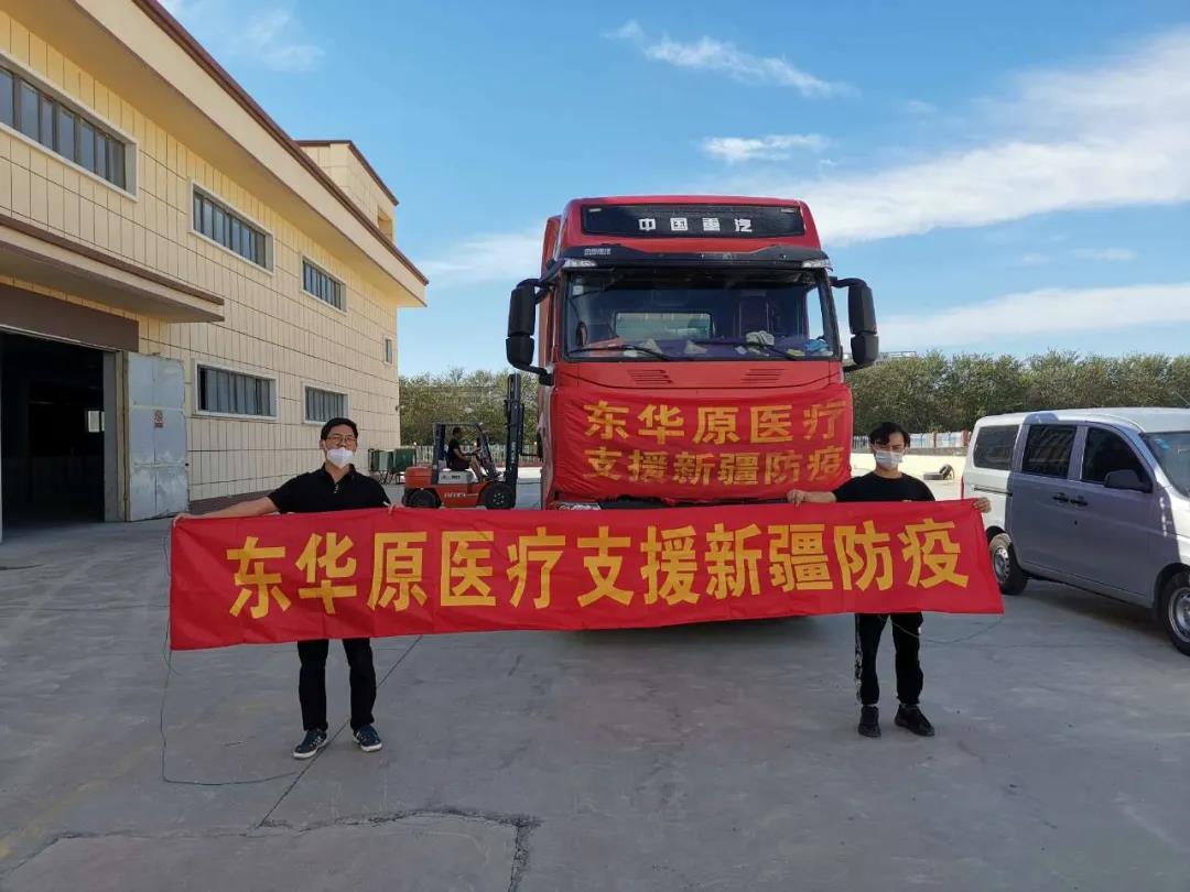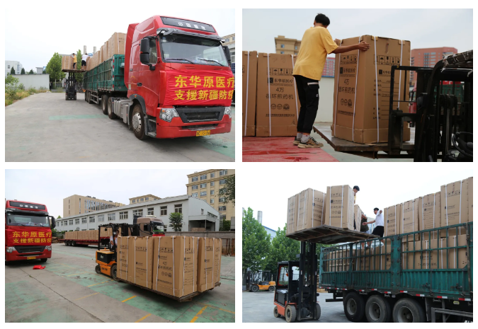 7月25日晚上9時20分,東華原醫(yī)療第一批支援新疆的各型號設備298臺及包裝耗材750套裝車完畢。滿載的貨車駛出大門,奔赴新疆。車上運載了60臺十功能煎藥機、148臺包裝機、其他各種不同規(guī)格的煎藥機90臺。在此之前,24日,東華原醫(yī)療1300套包裝卷已經踏上通往新疆的路。這一次,我們一輛17.5米、一輛13米、一輛9.6米的三輛大貨車,滿載著希望,出發(fā)!