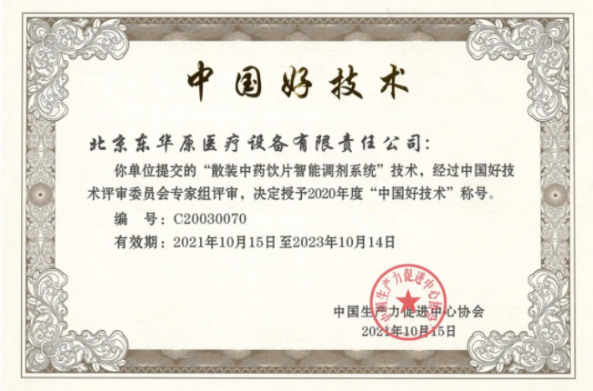 近日,2020年度“中國好技術(shù)”項目庫入選名單公布,北京東華原醫(yī)療設(shè)備有限責(zé)任公司“散裝中藥飲片智能調(diào)劑系統(tǒng)”技術(shù),經(jīng)過中國好技術(shù)評審委員會專家組評審,榮獲2020年度“中國好技術(shù)”稱號。