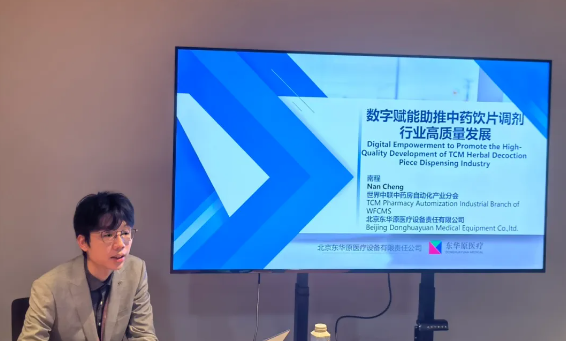 在中藥調劑傳承和創(chuàng)新分會場,東華原常務副總經理南程作“數字賦能推動中藥調劑高質量發(fā)展”專題報告,對中藥調劑的發(fā)展背景、發(fā)展現狀進行詳細分析,同時對比國際中藥調劑的發(fā)展趨勢,對未來中藥調劑的發(fā)展趨勢進行預測。搭建全流程藥事服務管理已成為中醫(yī)藥的發(fā)展趨勢,南程總在報告中,向全世界的中醫(yī)藥人展示了東華原在中藥房數字化、自動化、標準化、智能化方面取得的先進成果。