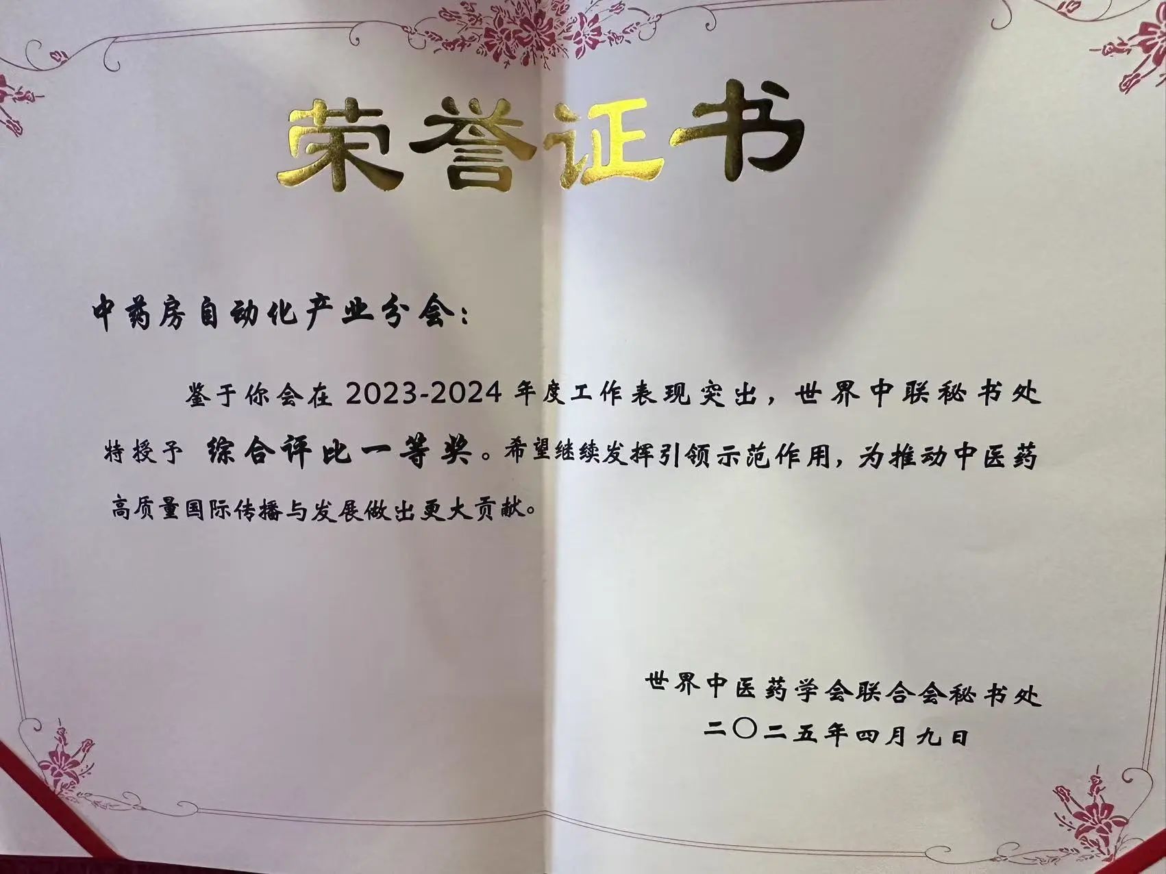 產(chǎn)業(yè)分會中唯一:中藥房自動化產(chǎn)業(yè)分會榮獲“2023-2024年度先進分支機構一等獎”