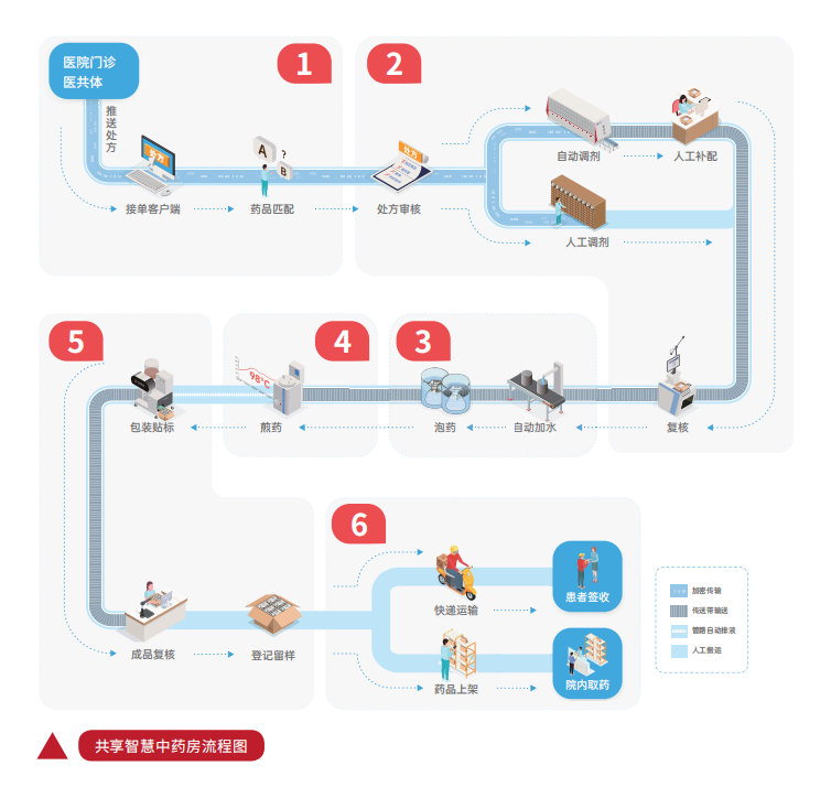 東華原智慧中藥房整體解決方案以計(jì)算機(jī)控制、物聯(lián)網(wǎng)及互聯(lián)網(wǎng)技術(shù)為核心,幫助醫(yī)院構(gòu)建從“接方-審方-調(diào)劑-煎煮-配送”的全流程智能化管理體系,通過智能調(diào)劑系統(tǒng)、智能煎煮設(shè)備打造“一人一方一碼”的追溯體系,實(shí)現(xiàn)中藥煎煮標(biāo)準(zhǔn)化操作、操作可視化,讓患者享受到“送藥上門”的服務(wù),大大改善傳統(tǒng)中醫(yī)藥“良藥苦等”的現(xiàn)象。