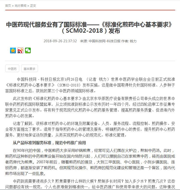 ????《標準化煎藥中心基本要求》(SCM0024-2018)發(fā)布不僅促進中醫(yī)藥國際標準體系建設,還將有力推動中醫(yī)藥的標準化、國際化發(fā)展進程。該標準的發(fā)布和實施,將有力的保證海內(nèi)外標準化煎藥中心代煎服務質(zhì)量,從而實現(xiàn)中藥煎藥服務的規(guī)范化、標準化和國際化。