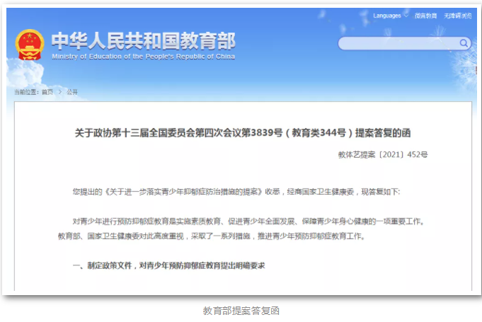 日前,關(guān)于政協(xié)《關(guān)于進(jìn)一步落實(shí)青少年抑郁癥防治措施的提案》,教育部進(jìn)行了答復(fù)。其中,明確將抑郁癥篩查納入學(xué)生健康體檢內(nèi)容,建立學(xué)生心理健康檔案,評(píng)估學(xué)生心理健康狀況,對(duì)測(cè)評(píng)結(jié)果異常的學(xué)生給予重點(diǎn)關(guān)注。