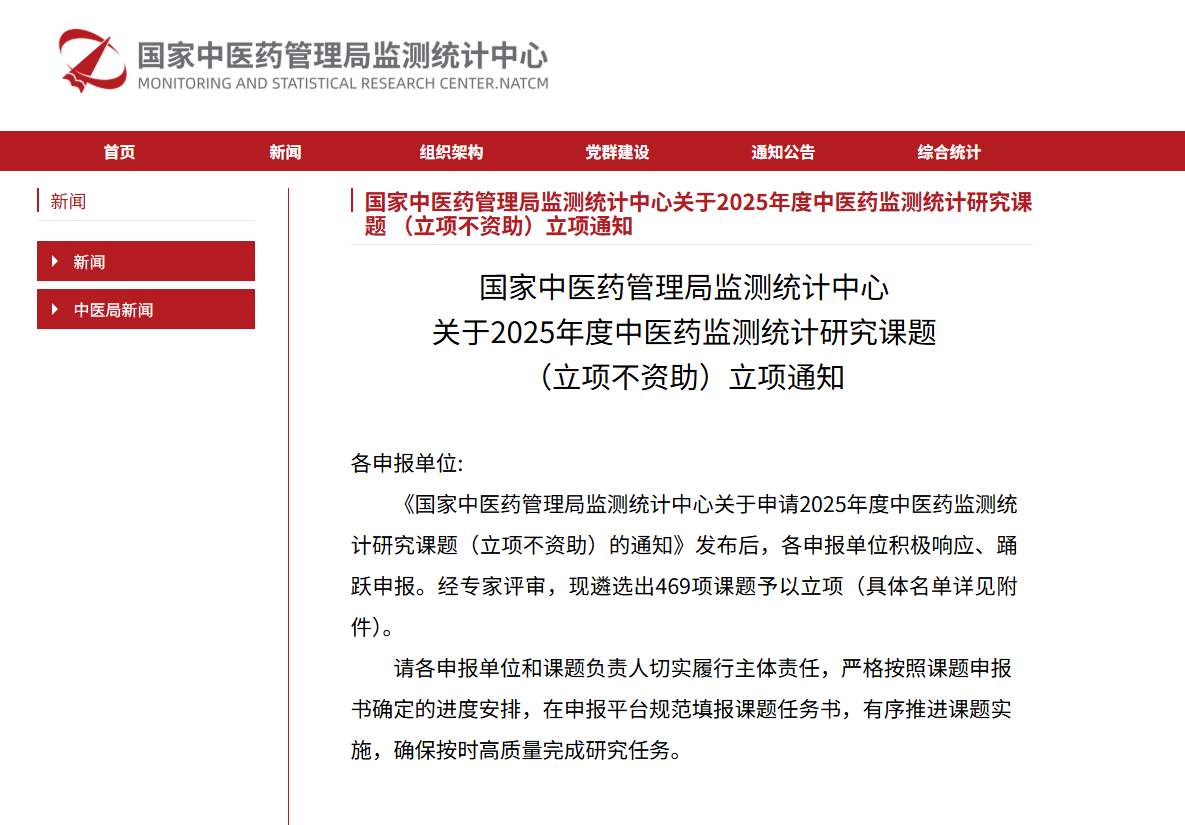 近日,國(guó)家中醫(yī)藥管理局監(jiān)測(cè)統(tǒng)計(jì)中心發(fā)布了《國(guó)家中醫(yī)藥管理局監(jiān)測(cè)統(tǒng)計(jì)中心關(guān)于2025年度中醫(yī)藥監(jiān)測(cè)統(tǒng)計(jì)研究課題(立項(xiàng)不資助)立項(xiàng)通知》。東華原申報(bào)的4項(xiàng)課題通過(guò)審批,成功立項(xiàng)。