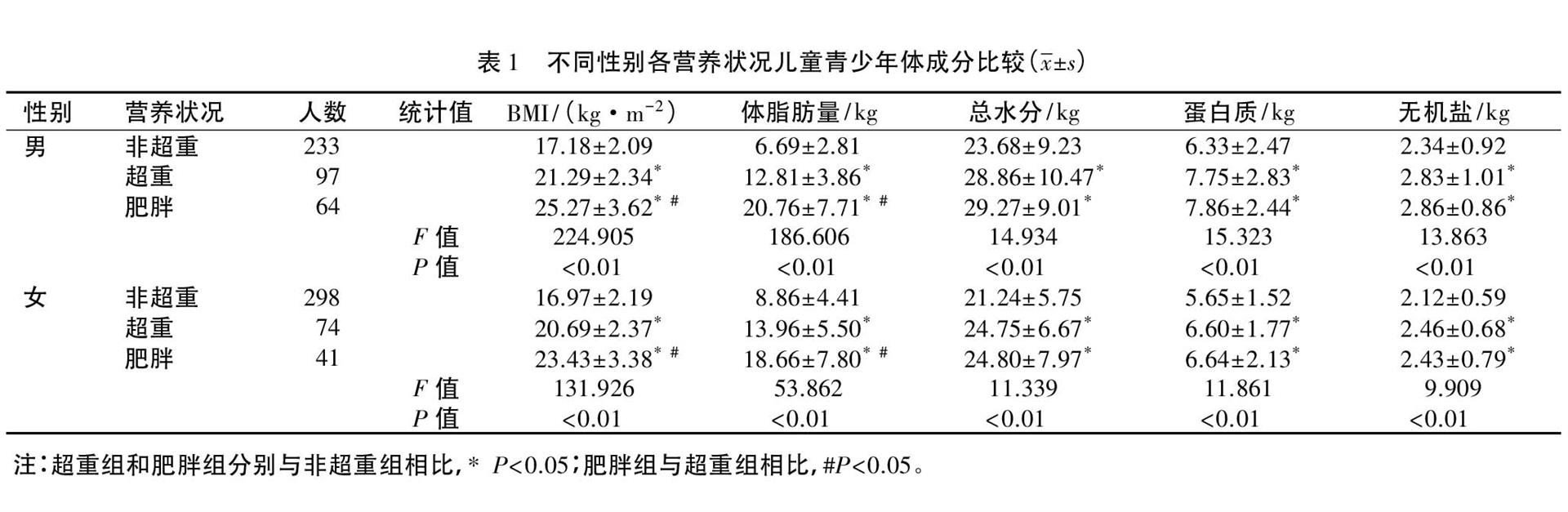 2.1 不同營養(yǎng)狀況兒童青少年體成分比較 807 名中小學(xué)生中,非超重組531 名,占65.8%,其中男生233名,女生 298 名;超重組 171 名,占 21.2%,其中男生 97名,女生 74 名;肥胖組 105 名,占 13.0%,其中男生 64名,女生 41 名。經(jīng)正態(tài)分布檢驗,男、女生不同營養(yǎng)狀況的體成分均符合正態(tài)分布。由表1 可見,男、女生不同營養(yǎng)狀況組間體成分差異均有統(tǒng)計學(xué)意義(P 值均<0.01)。兒童青少年的 BMI、體脂肪量、總水分、蛋白質(zhì)、無機鹽均值均為肥胖組、超重組>非超重組,不論男女,差異均有統(tǒng)計學(xué)意義(t 男 值分別為 - 17. 102,- 14. 341,-4.307,-4.385,-4.088,-14.969,-14.129,-4.235,-4.290,-4.094;t 女 值分別為 11.901,7.876,2.765,2.852,2.470,12.846,7.406,4.552,4.649,4.315,P 值均<0.05);肥胖組和超重組相比,除女生的無機鹽含量均值超重組>肥胖組,其他均為肥胖組>超重組,但是僅 BMI 和體脂肪量差異均有統(tǒng)計學(xué)意義(t 男 值分別為 -7.780,-7.646;t 女 值分別為 -5.096,-3.771,P 值均<0.05)。