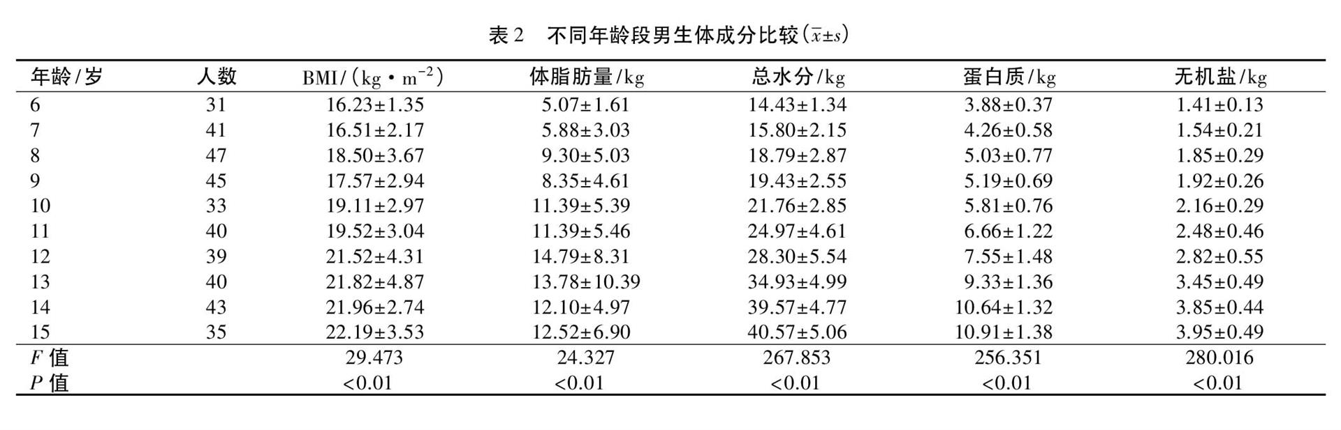 2.2 不同年齡段兒童青少年體成分比較 見表 2~3。