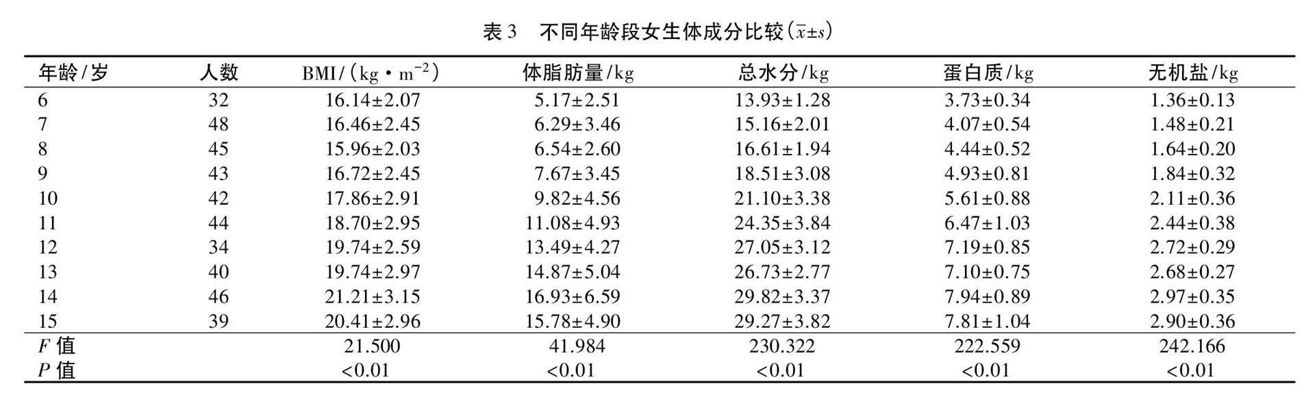 由表 2~3 可見,男、女生的 BMI 逐年增長,差異均有統(tǒng)計學(xué)意義(P 值均<0.01);男生每個年齡段的 BMI都高于女生,僅 8,12,13,15 歲的差異均有統(tǒng)計學(xué)意義(t 值分別為 4.141,2.167,3.261,2.348,P 值均<0.05)。男生 6~12 歲階段的體脂肪量逐年增加,13 歲開始逐年減少,女生的體脂肪量逐年增加,差異均有統(tǒng)計學(xué)意義(P 值均<0.01);12 歲之前男生體脂肪量均值大于女生,13 歲以后體脂肪量均值小于女生,其中8,14,15 歲的差異均有統(tǒng)計學(xué)意義(t 值分別 3.321,-3.882,-2.359,P 值均<0.05)。男、女生的總水分、蛋白質(zhì)、無機鹽均值逐年增加,差異均有統(tǒng)計學(xué)意義(P 值均<0.01);男生每個年齡段以上 3 種體成分的均值都大于女生,其中 8,13,14,15 歲的差異均有統(tǒng)計學(xué)意義(t 值分別為 4.232,10.064,11.202,10.738,P 值均<0.05)。