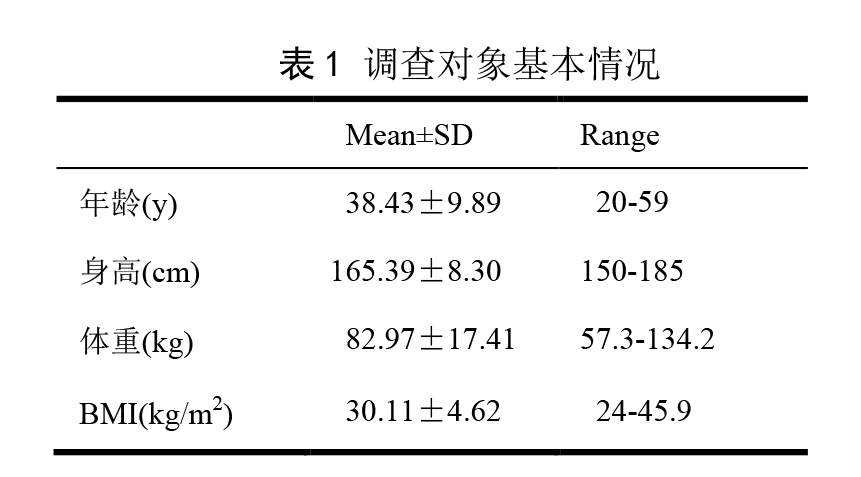 1.1 對象 2013 年 11 月 9 日至 2014 年 1 月 25 日間,在知情同意的基礎(chǔ)上,招募 BMI≥24,年齡 20~60 歲的成年人共 148 人,其中男性 61 人,女性 87 人,如表 1 所示,平均年齡為38.43±9.89 歲,平均身高為 165.39±8.30cm,平均體重為 82.97±17.41kg,平均 BMI 為 30.11±4.62,按中國成人超重和肥胖癥預(yù)防控制指南中 [6] 的肥胖、超重范圍進(jìn)行分組,24≤BMI<28 為超重,BMI≥28 為肥胖。經(jīng)詢問病史,排除各種重要臟器病史(如心血管疾病、肺炎、肝炎、胃炎、腎炎等)、身體發(fā)育缺陷、代謝性疾病等,所有受試者分別同時采用 BIA和 DXA 測定人體成分。