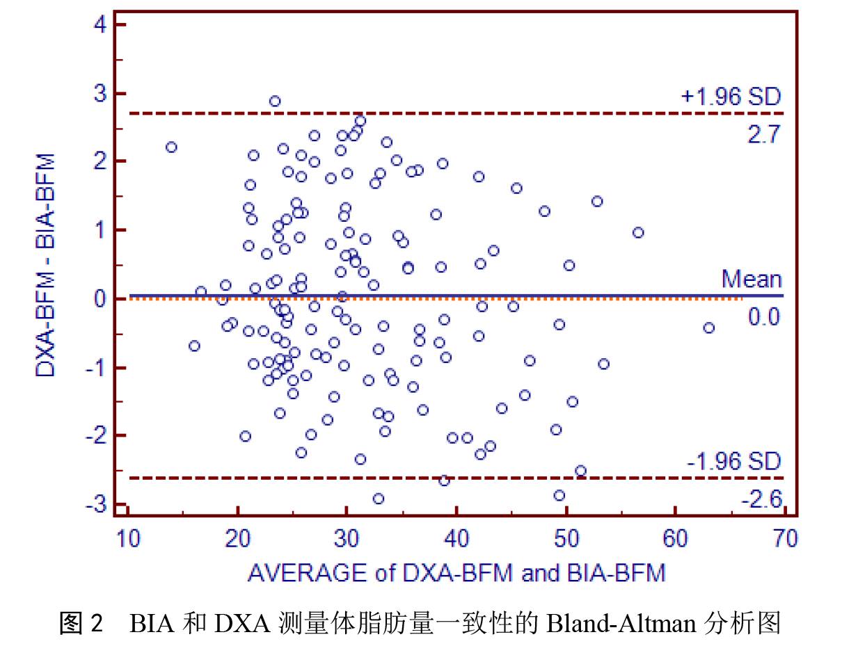 2.2 兩種方法測量結(jié)果的一致性分析 對 BIA 和 DXA 人體成分分析儀測量人體脂肪率的一致性進(jìn)行Bland-Altman 分析,如圖 1 所示,從圖中可以看出,148 個點中有 7 個位于一致性界限范圍以外,比例為 4.73%,小于 5%。在一致性界限范圍內(nèi),BIA 與 DXA 測量結(jié)果差值的絕對值最大為 3.30,兩種方法測量結(jié)果的平均值為 39.15,這種相差的幅度在臨床上可以接受,因此可以認(rèn)為兩種方法測量的結(jié)果具有較好的一致性,兩種方法在臨床上測量脂肪率時可以互相代替使用。