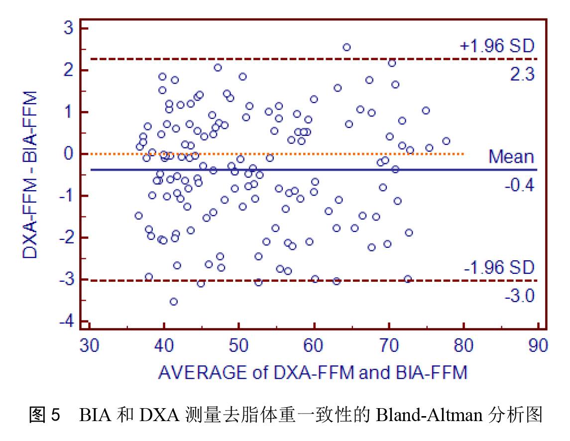 對 BIA 和 DXA 測量人體去脂體重的一致性進(jìn)行 Bland-Altman 分析,如圖 5 所示,從圖中可以看出,148 個點中有 5 個位于一致性界限范圍以外,比例為 3.38%,小于 5%。在一致性界限范圍內(nèi),BIA 與 DXA 測量結(jié)果差值的絕對值最大為 2.99,兩種方法測量結(jié)果的平均值為 60.11,這種相差的幅度在臨床上可以接受,因此可以認(rèn)為兩種方法測量的結(jié)果具有較好的一致性,兩種人體成分分析儀方法在臨床上測量脂肪率時可以互相代替使用。