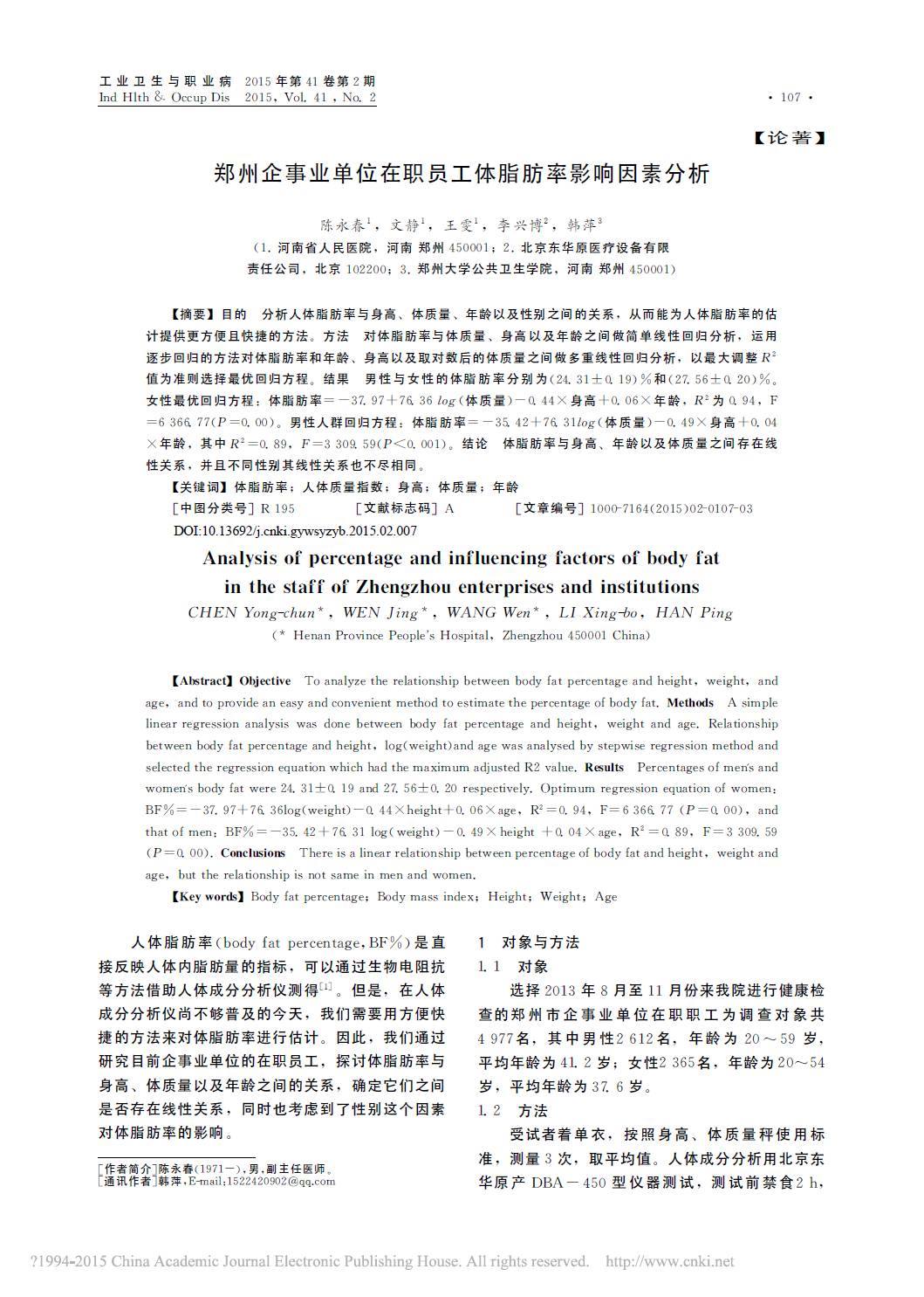 鄭州企事業(yè)單位在職員工體脂肪率影響因素分析