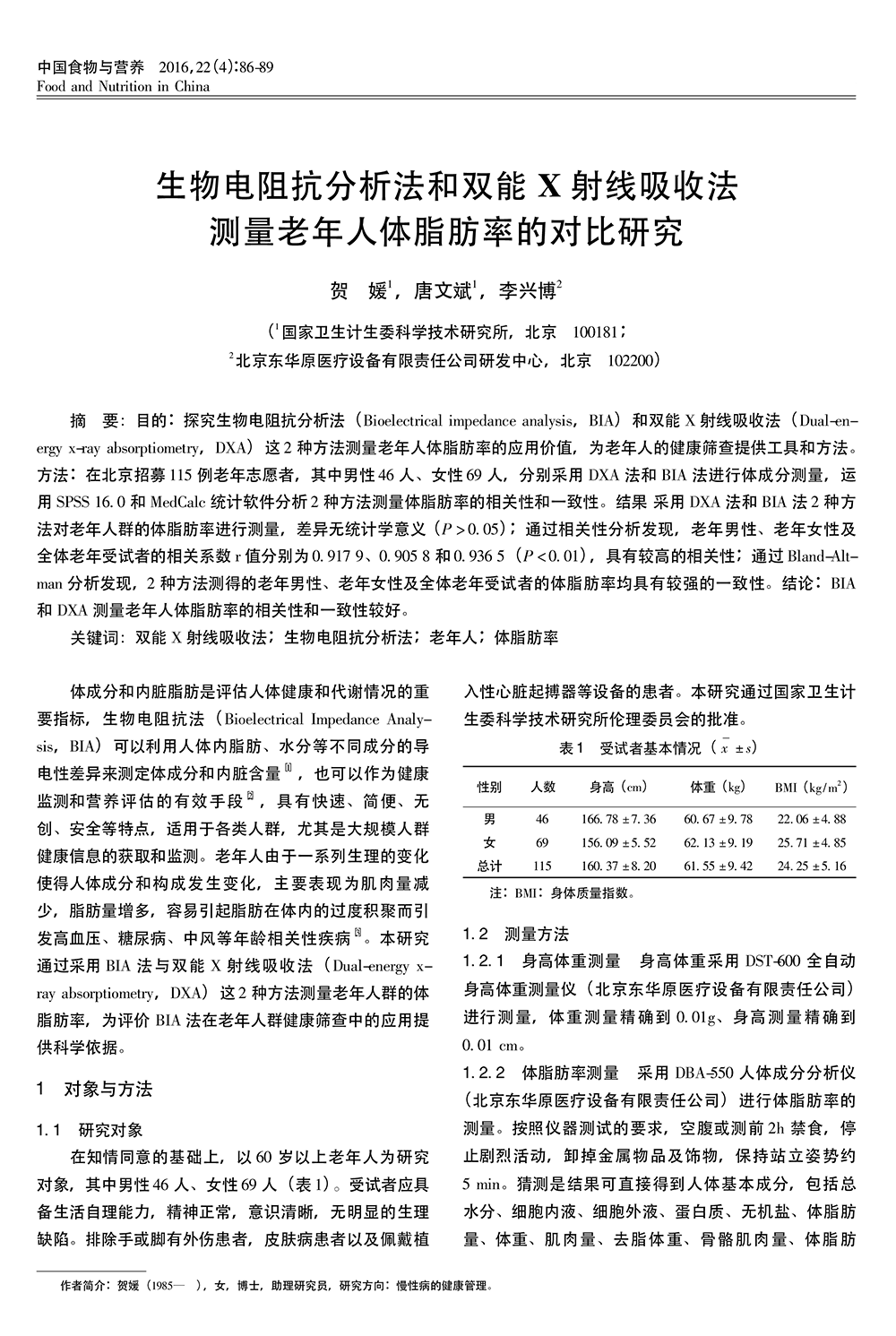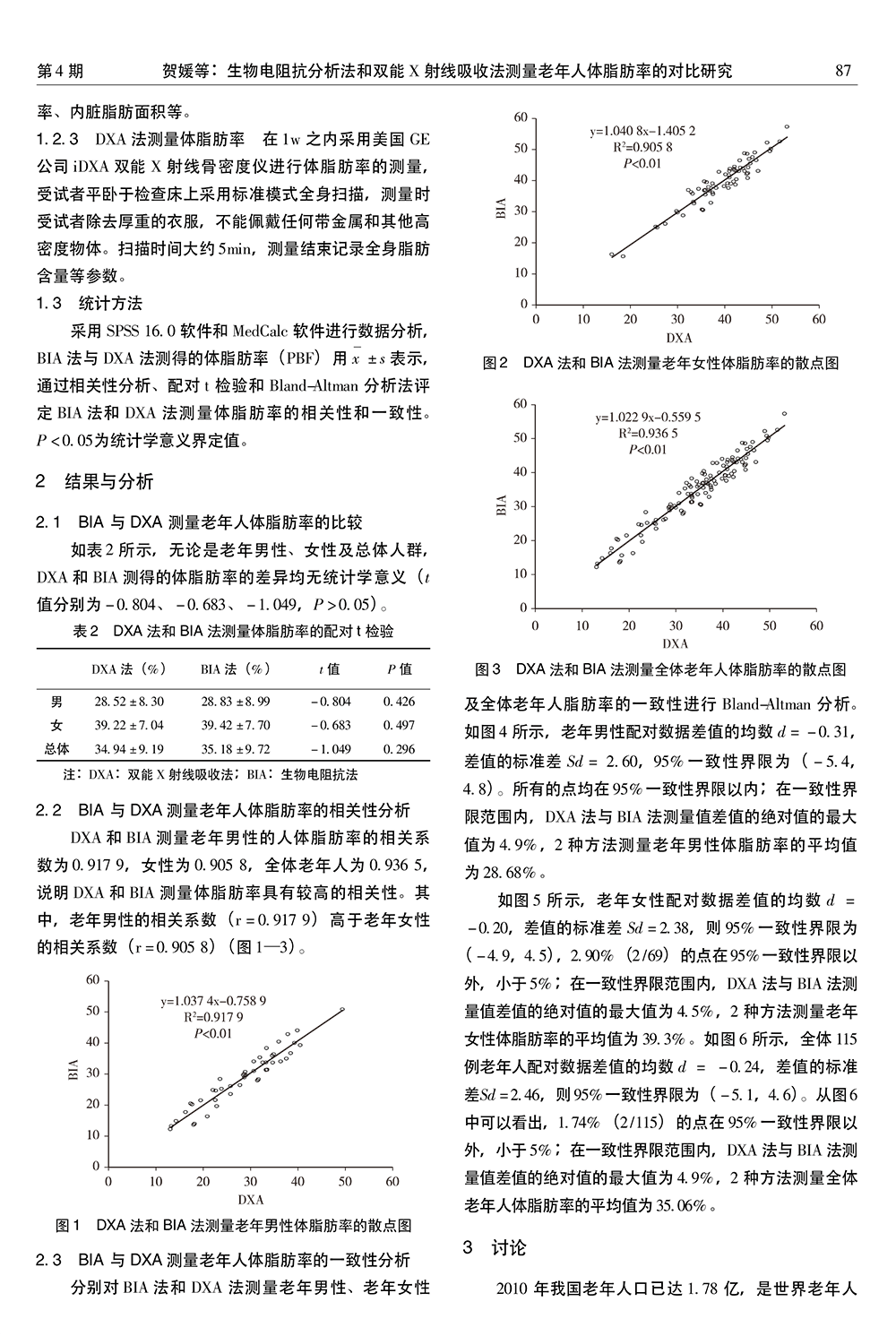 生物電阻抗分析法和雙能X射線(xiàn)吸收法測(cè)量老年人體脂肪率的對(duì)比研究