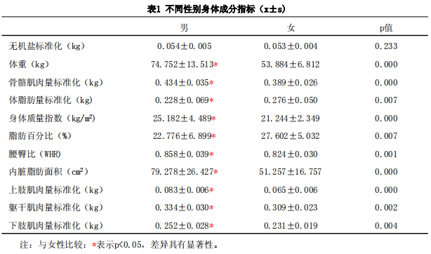 選取指標(biāo):無機(jī)鹽(單位:kg),體重(單位:kg),骨骼肌肉量(單位:kg),體脂肪量(單位:kg),身體質(zhì)量指數(shù)(單位:kg/m2),體脂肪率(單位:%),腰臀比,內(nèi)臟脂肪面積(單位:cm2),上肢肌肉量(單位:kg),軀干肌肉量(單位:kg),下肢肌肉量(單位:kg)。