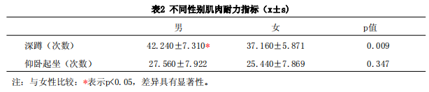 從久坐人群肌肉耐力指標(biāo)測(cè)試結(jié)果可以看出(表2),男性久坐人群深蹲次數(shù)顯著高于女性。而性別在仰臥起坐次數(shù)指標(biāo)上差異不顯著。
