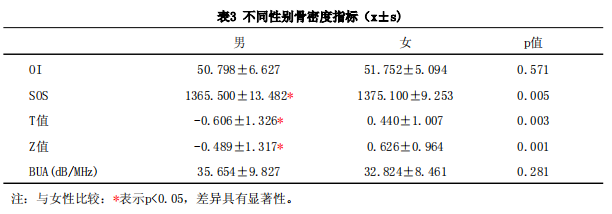 從久坐人群骨密度指標(biāo)測(cè)試結(jié)果可以看出(表3),女性久坐人群超聲波骨密度、T值和Z值三個(gè)指標(biāo)上均顯著高于男性(p<0.05)。