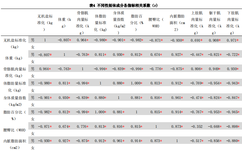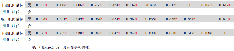 由表5可以看出,久坐人群男性的超聲波傳導(dǎo)速度與無機(jī)鹽、體重、骨骼肌肉量、體脂肪量、身體質(zhì)量指數(shù)、脂肪百分比、腰臀比、內(nèi)臟脂肪面積、上肢肌肉量、軀干肌肉量、下肢肌肉量這些體成分指標(biāo)之間存在一定的負(fù)相關(guān)(p<0.05);久坐人群女性的各項(xiàng)骨密度與體成分各項(xiàng)指標(biāo)相關(guān)關(guān)系不顯著(p>0.05)。