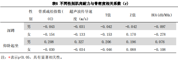 由表6可以看出,久坐人群男女的骨密度指標(biāo)和肌肉耐力指標(biāo)均無顯著性相關(guān)(p>0.05)。