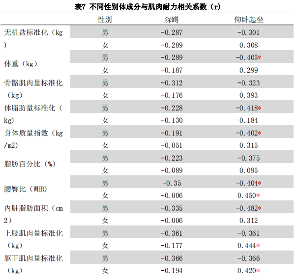 由表7可以看出,久坐人群男性的仰臥起坐次數(shù)與體脂肪量、身體質(zhì)量指數(shù)、腰臀比、內(nèi)臟脂肪面積這些體成分指標(biāo)之間存在一定的負(fù)相關(guān)(p<0.05);久坐人群女性的仰臥起坐次數(shù)與腰臀比、上肢肌肉量、軀干肌肉量這些指標(biāo)存在一定的正相關(guān)(p<0.05)。久坐人群深蹲次數(shù)和體成分指標(biāo)之間相關(guān)性不顯著(p>0.05)。