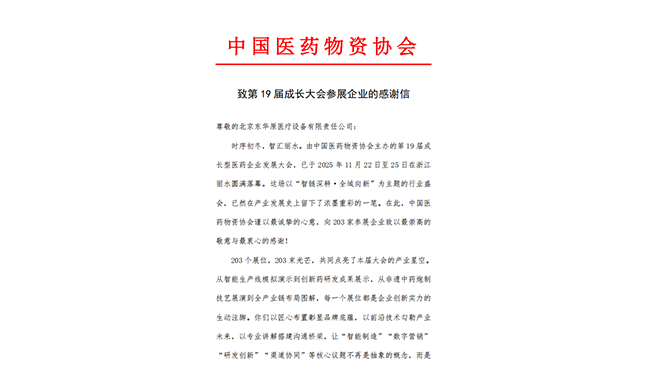 近日,东华原收到中国医药物资协会发来的感谢信,对第19届成长大会期间带来的宝贵经验分享与全力支持表示感谢,字里行间写满对东华原企业创新实力的高度认可。