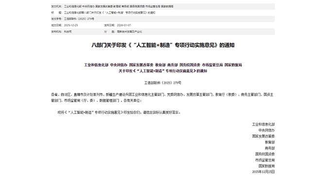- 1月7日,工业和信息化部、中央网信办、国家发展改革委等八部门联合发布《“人工智能+制造”专项行动实施意见》(以下简称《实施意见》)。《实施意见》提出,加快推进人工智能技术在制造业融合应用,打造新质生产力,全方位、深层次、高水平赋能新型工业化。