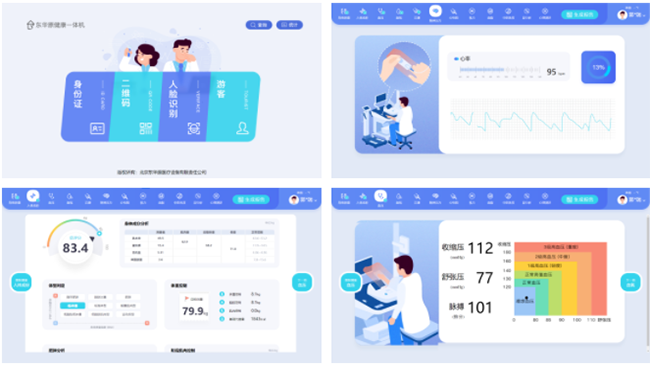 - 东华原健康管理一体机来啦健康管理一体机是什么?健康管理一体机应用互联网、物联网及多种信息识别和信息传输技术,采集受测人员的多项身体体征数据,进行信息收集、分类、储存和分析,将个人信息及健康档案实时上传至管理工作站,实现慢性病人群的分类与持续管理,并支持上传至公共卫生管理服务平台和HIS等医疗信息化平台。一台健康管理一体机等于什么?检测项目 ●基本检测项目:血压、脉率、心电、体温、血氧、中医体质