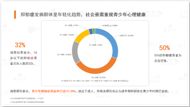 - 人民日报健康客户端、健康时报、好心情心理医疗和心理健康数字服务平台、灵北中国、抑郁研究所,共同发布《2022国民抑郁症蓝皮书》。蓝皮书通过用户调研、文献研究、专家评定分析等方法,汇聚分析大量数据,聚焦国民抑郁症现状、抑郁症患者现状、患者就医现状、患者用药现状、预防与干预5大方面,呼吁国民重视心理健康,探讨新兴诊疗模式。5成抑郁患者为在校生,41%曾因抑郁休学用户调研结果显示,62.36%的人经常感到抑郁,情绪压