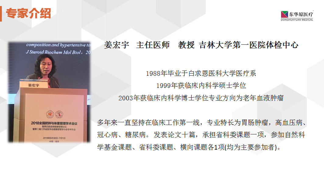 本次大會邀請了健康管理知名專家分享肥胖和體重管理最新研究進(jìn)展與成果,是繼2013年創(chuàng)辦以來召開的又一次極具重要意義的學(xué)術(shù)盛會。大會的優(yōu)秀論文交流環(huán)節(jié)中,東華原特邀專家——吉林大學(xué)第一醫(yī)院的姜宏宇教授,分享了《體成分檢測在健康管理領(lǐng)域的研究進(jìn)展》。
