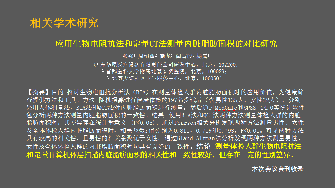 姜教授在講解中特別介紹了東華原董事長南龍攜研發(fā)團(tuán)隊(duì)編寫的論文——《應(yīng)用生物電阻抗法和定量CT法測量內(nèi)臟脂肪面積的對比研究》及東華原人體成分分析儀DBA-550的工作原理及測量方法。