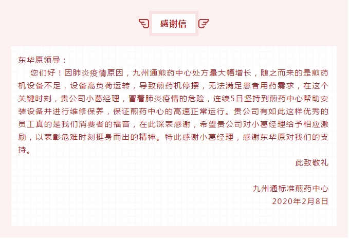 這是一條來自九州通標(biāo)準(zhǔn)煎藥中心的感謝信,九州通標(biāo)準(zhǔn)煎藥中心在此次新冠肺炎疫情防控阻擊戰(zhàn)中,承擔(dān)著武漢多家醫(yī)院的中藥煎煮任務(wù),工作量大且任務(wù)艱巨。而東華原醫(yī)療作為九州通標(biāo)準(zhǔn)煎藥中心煎藥設(shè)備及耗材的供應(yīng)商,力圖做好一切設(shè)備檢修維護(hù)、耗材24小時供應(yīng)等保障性工作。