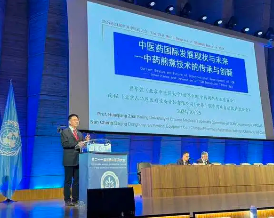 北京中醫(yī)藥大學翟華強教授聯(lián)名南程在設立于聯(lián)合國教科文組織一號大廳的主會場,作“中藥煎煮技術的傳承和創(chuàng)新”主旨報告。