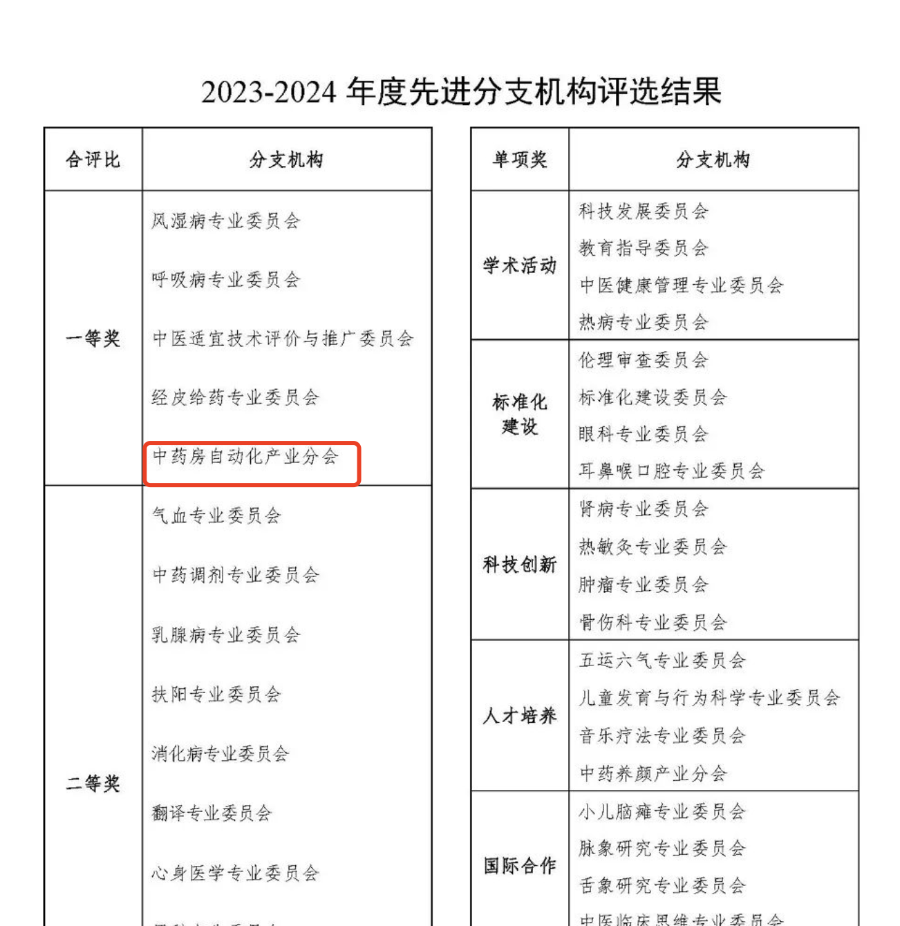 產(chǎn)業(yè)分會中唯一:中藥房自動化產(chǎn)業(yè)分會榮獲“2023-2024年度先進分支機構一等獎”