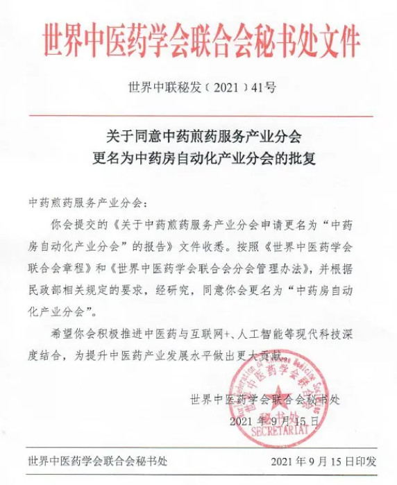 2021年9月15日,經(jīng)世界中醫(yī)藥學(xué)會聯(lián)合會批復(fù)同意,中藥煎藥服務(wù)產(chǎn)業(yè)分會正式更名為“中藥房自動(dòng)化產(chǎn)業(yè)分會”。自即日起,原分會名稱“中藥煎藥服務(wù)產(chǎn)業(yè)分會”不再使用。