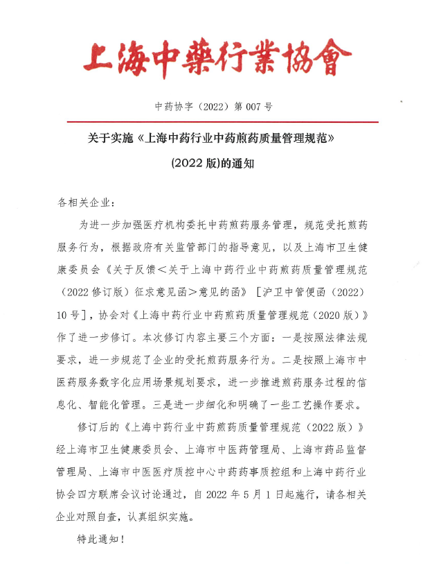 第三十九條?本規(guī)范自2022年5月1日起施行,《上海中藥行業(yè)中藥煎藥質(zhì)量管理規(guī)范》(2020版)同時廢止。