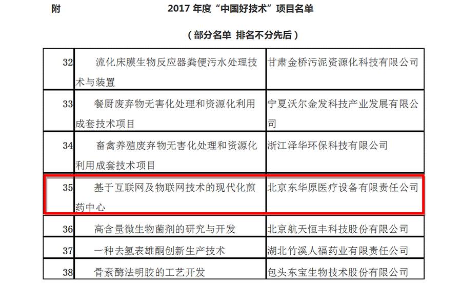 2018年5月11日中國(guó)生產(chǎn)力促進(jìn)中心協(xié)會(huì)公布了2017年度“中國(guó)好技術(shù)”評(píng)審結(jié)果。其中北京東華原醫(yī)療設(shè)備有限責(zé)任公司的《基于互聯(lián)網(wǎng)及物聯(lián)網(wǎng)技術(shù)的現(xiàn)代化煎藥中心》入圍2017年度 “中國(guó)好技術(shù)”獎(jiǎng)項(xiàng)。