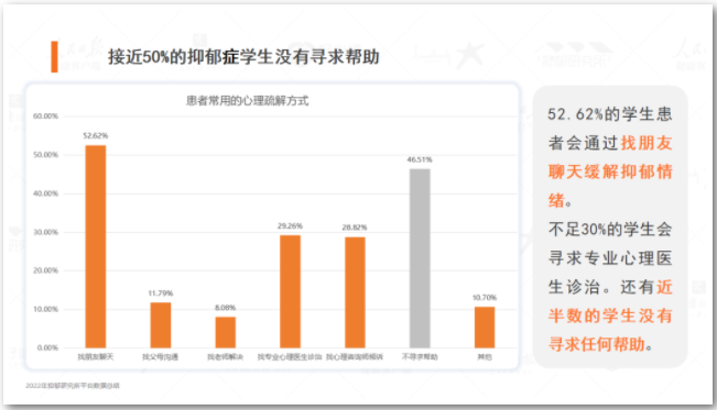 藍皮書還透露,有一半的抑郁癥學生患者會通過朋友傾訴、父母溝通或其他渠道進行求助,但仍有46%的學生沒有尋求任何幫助,近30%從未想過尋求專業(yè)心理醫(yī)生的幫助。
