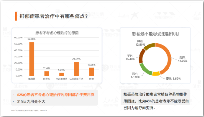 藍皮書顯示,抑郁癥患者治療中存在諸多痛點。“費用高”是阻擋患者長期接受心理治療的“攔路虎”。在接受藥物治療的患者中,“變胖”“惡心”“手抖”“便秘”等副作用成為其高度關注的問題。